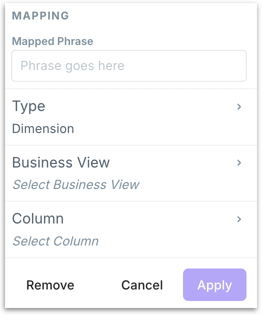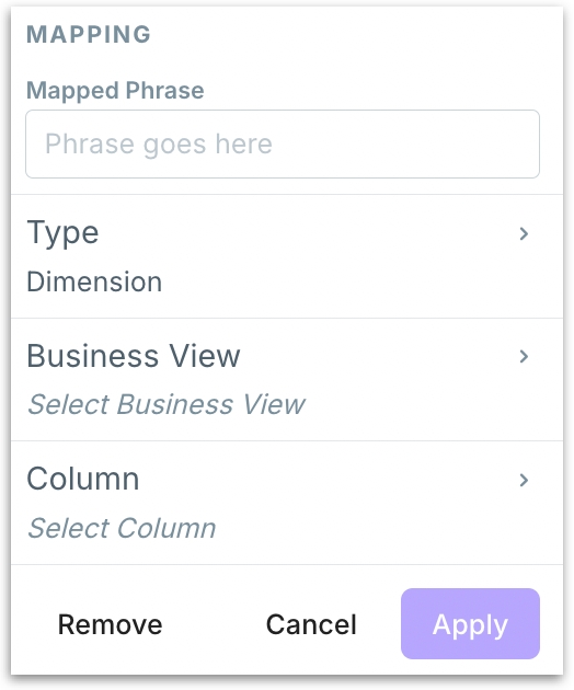 Custom Mappings: Turn on to bind tokens from the query to exact Business View fields, eliminating column ambiguity. Ideal for situations when multiple synonyms or overlapping names exist. Click on Add Mapping and the following window appears.