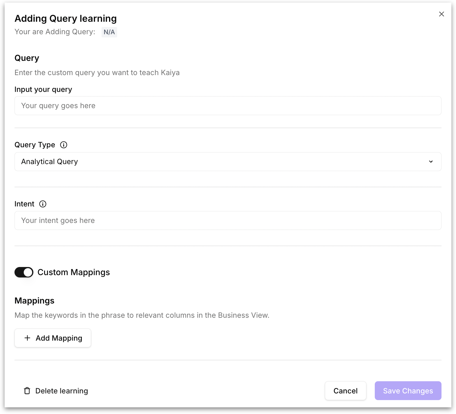 Create Query Learnings in Kaiya to define how full questions are interpreted. Set intents, mappings, and query logic for consistent, org-wide understanding.