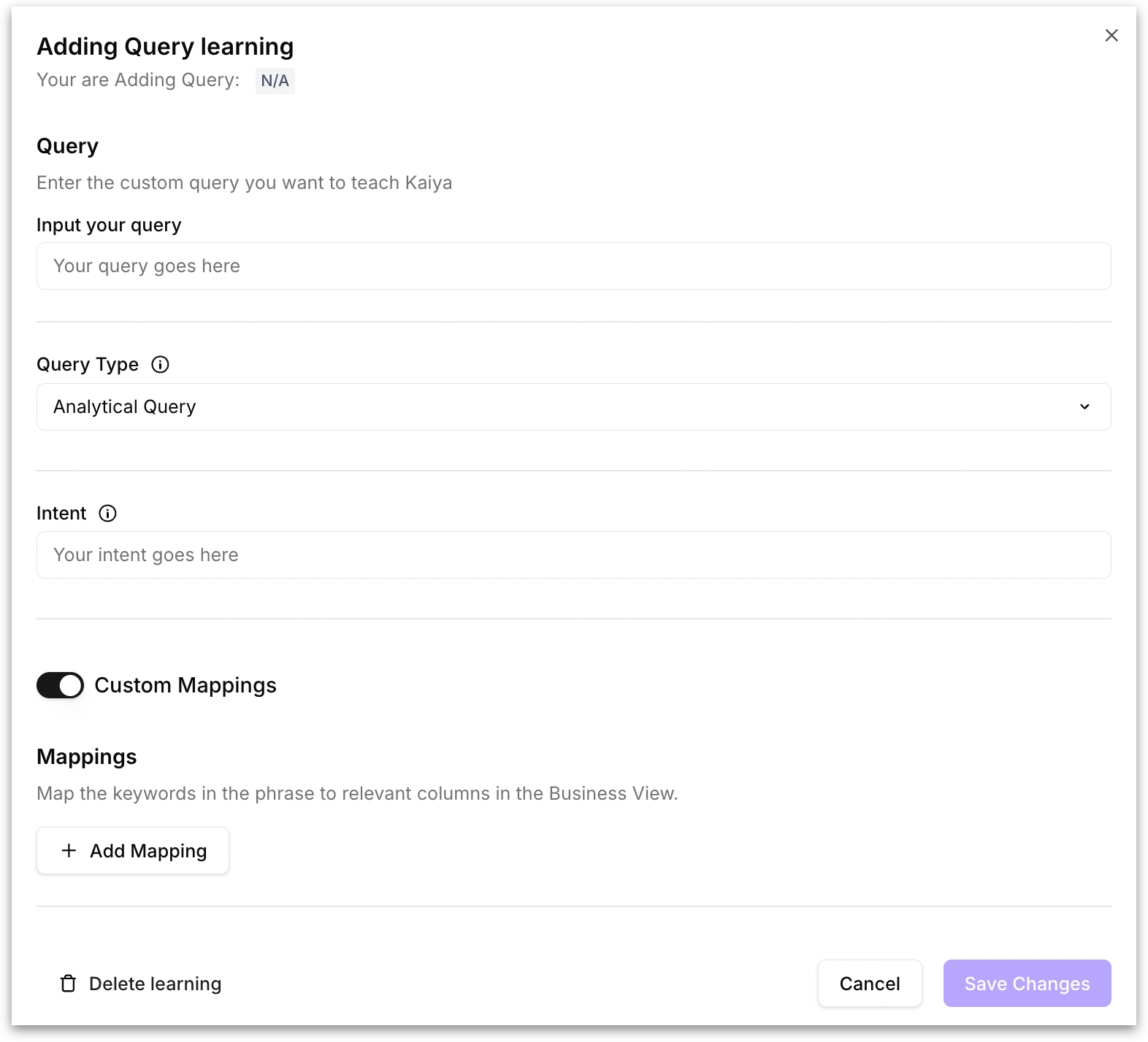 A Query Learning fixes how Kaiya should interpret a full question pattern (aggregation, grouping, filters, time windows, ranking). It must include an Intent so Kaiya can reuse the learning for similar phrasings.