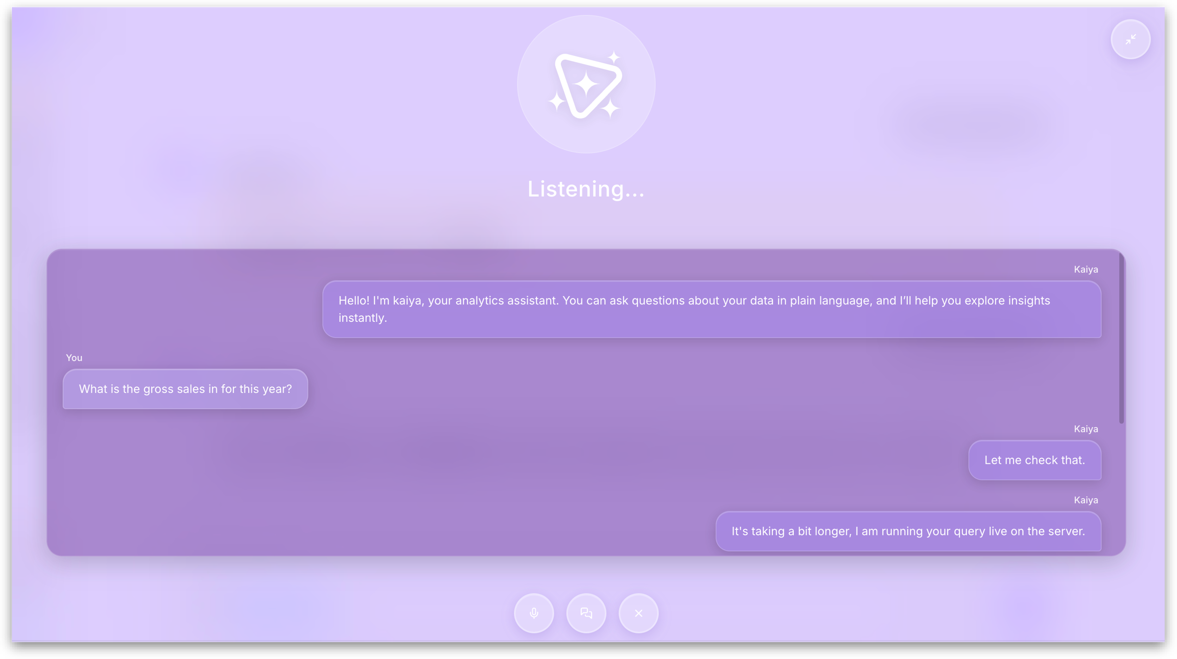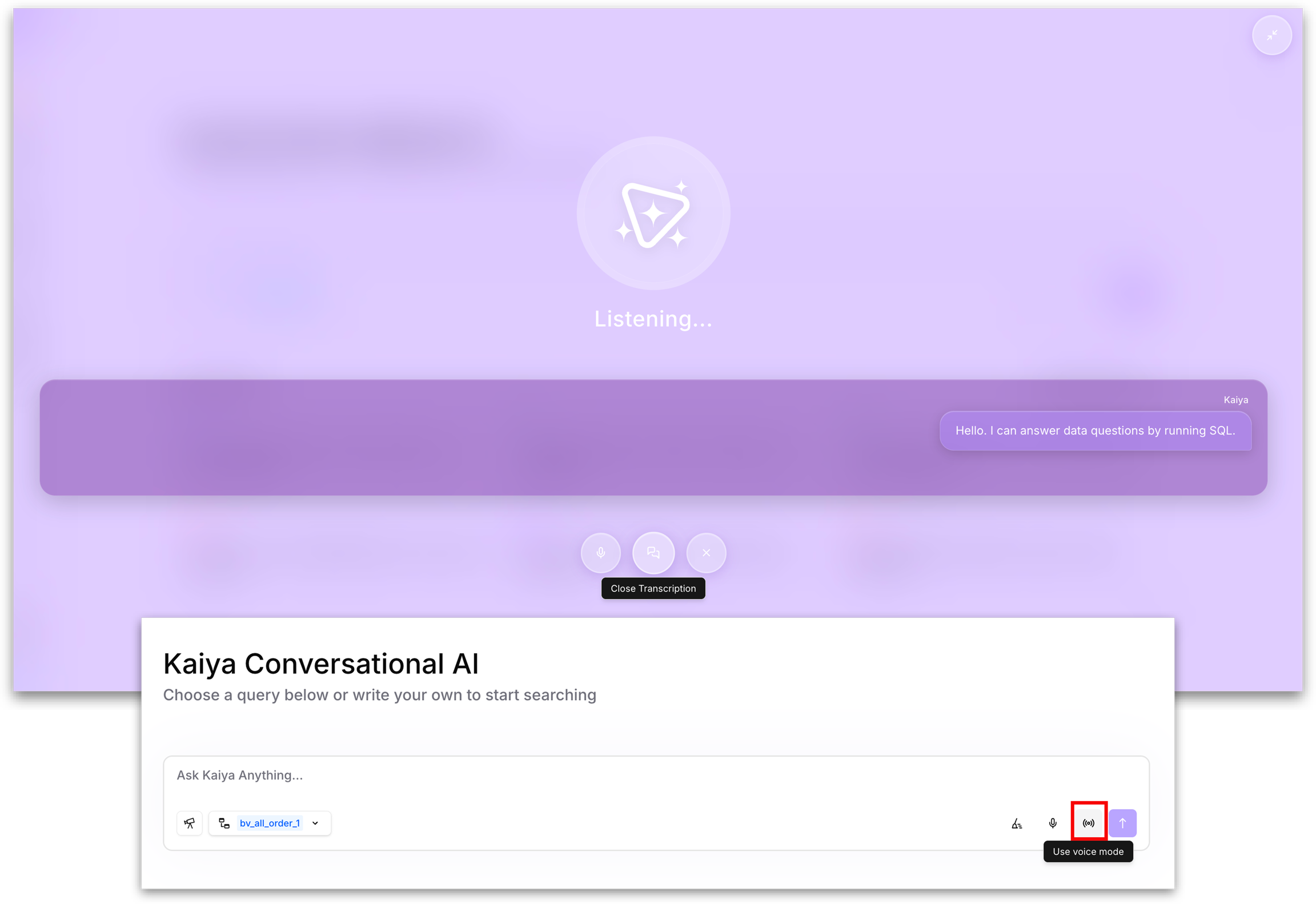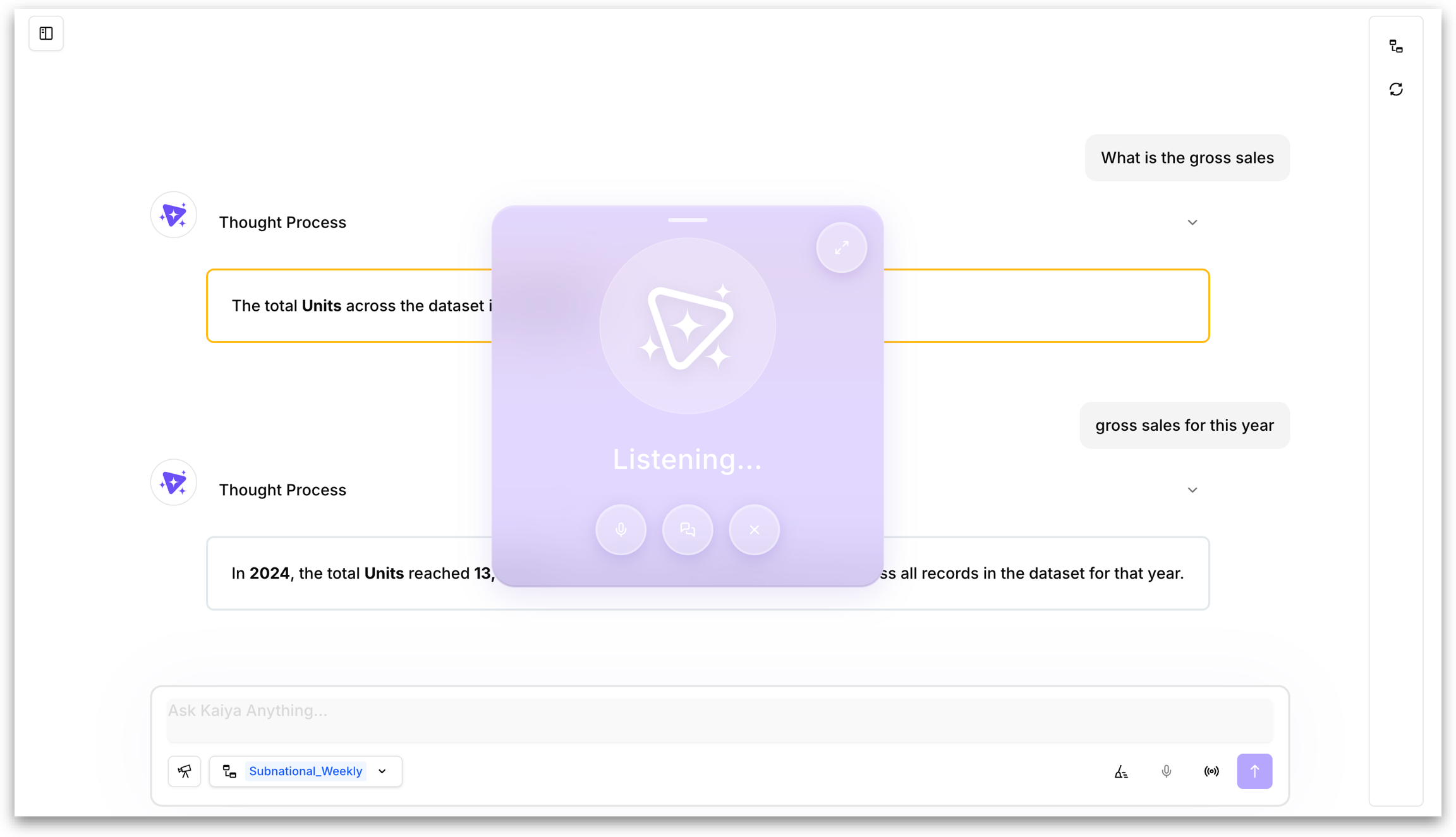 Click or tap the voice button and speak your question naturally. You do not need to use precise, structured language; Kaiya is designed to interpret conversational speech and extract the analytical intent.