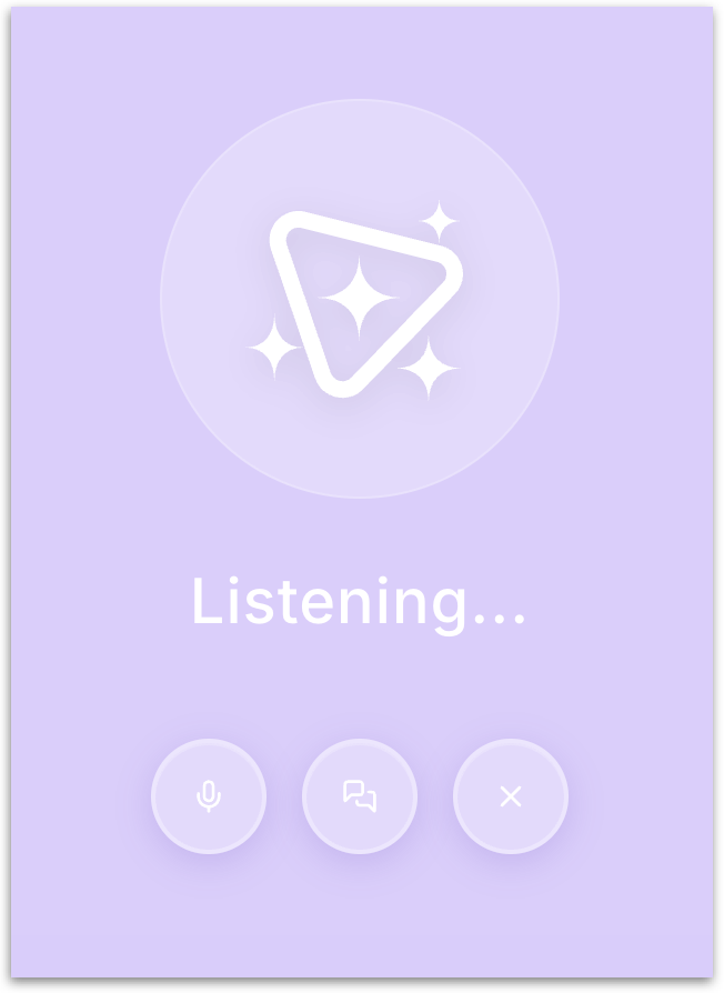 When conversing with Kaiya in voice mode, a purple overlay window appears over the Kaiya interface. The window displays the Kaiya logo with a "Listening..." indicator that confirms Kaiya is actively listening for your voice input. At the bottom of this window, three control buttons are available, along with an additional option to minimize the window.