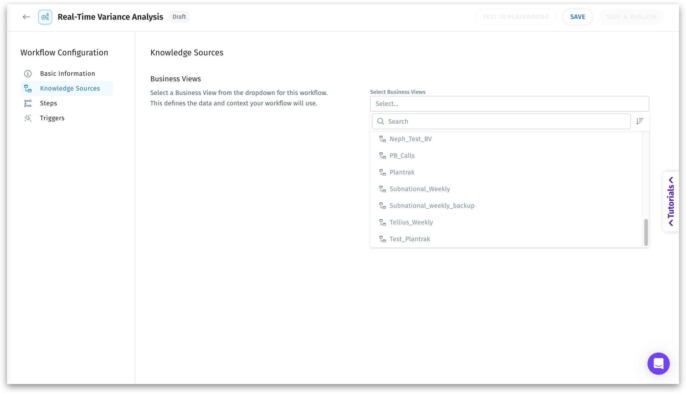 Select the data source for your workflow. Use the dropdown or search bar to select an existing Business View. This becomes the primary input for all agents in the workflow.
