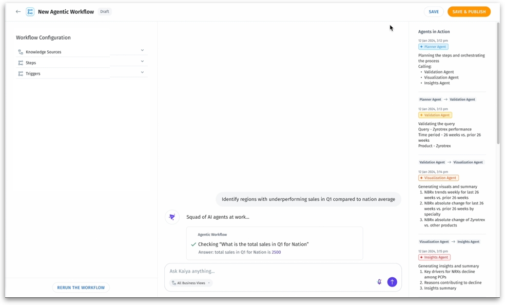 In the right pane, you can see the agents in action. This section will show how Kaiya interprets your query, what agents it activates, and what output is generated (visuals, summaries, insights).