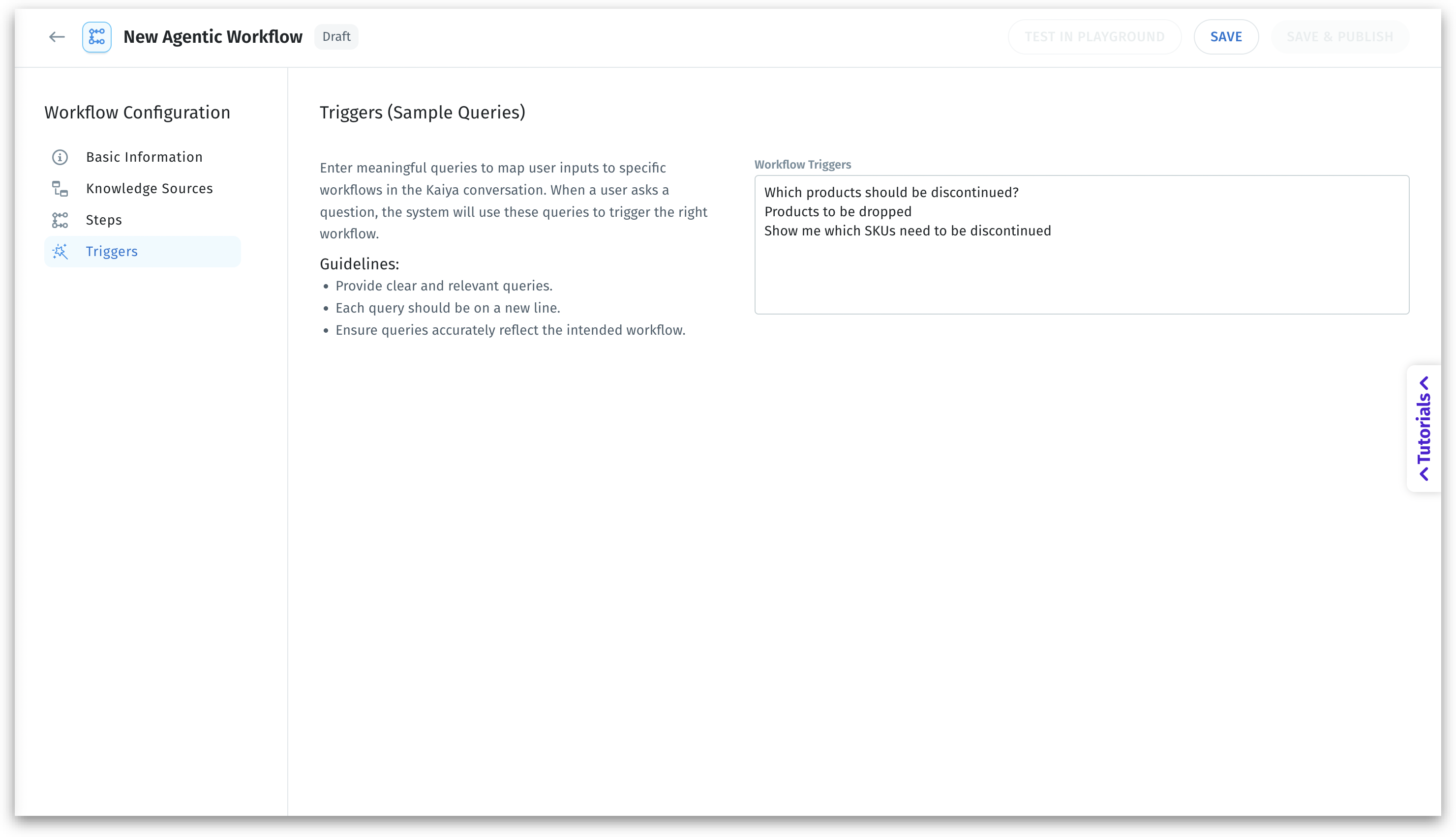 You can enter as many variations as you like. This increases the chances your workflow is selected by Kaiya when users input related queries.