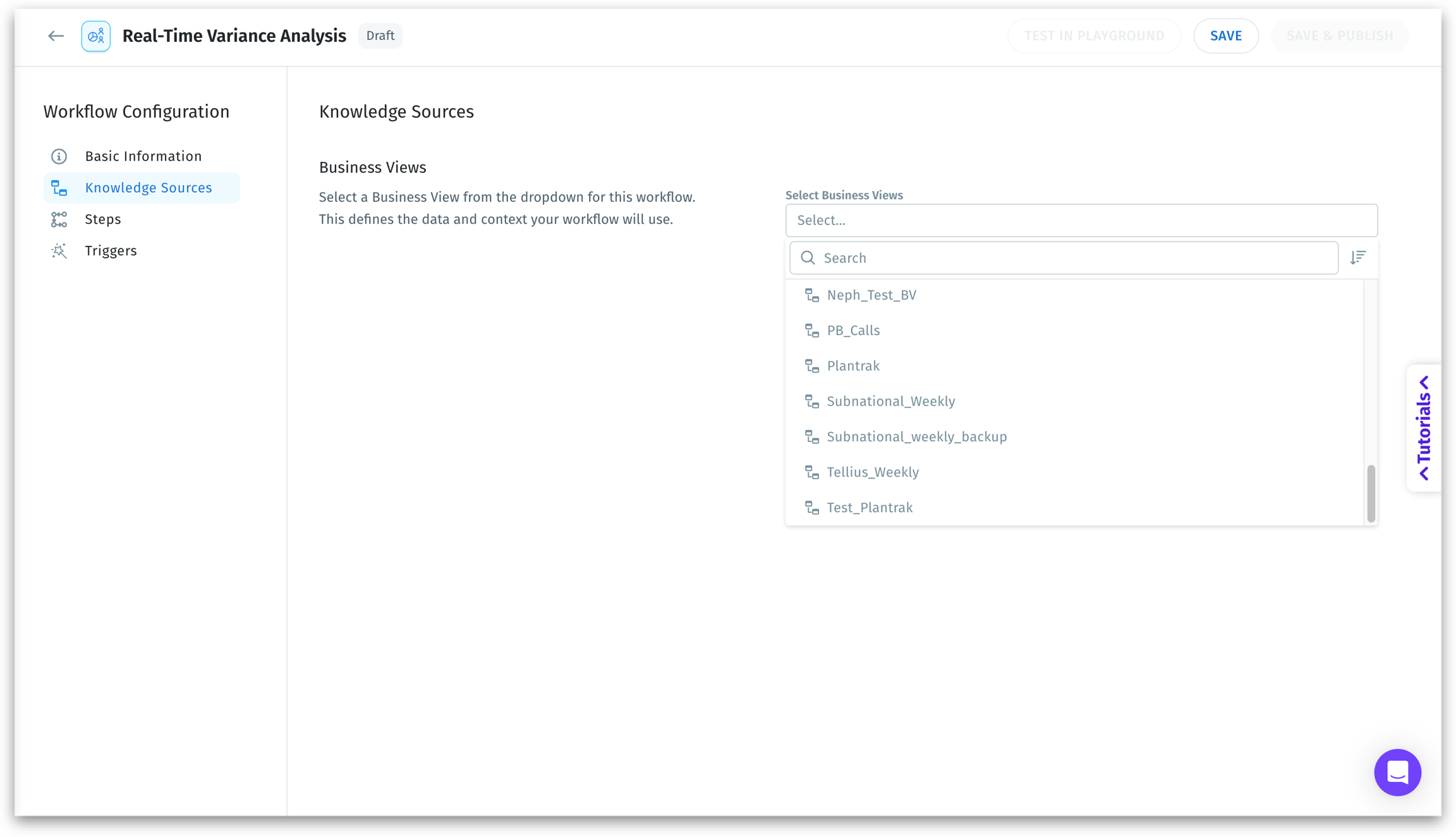 Select the data source for your workflow. Use the dropdown or search bar to select an existing Business View. This becomes the primary input for all agents in the workflow.