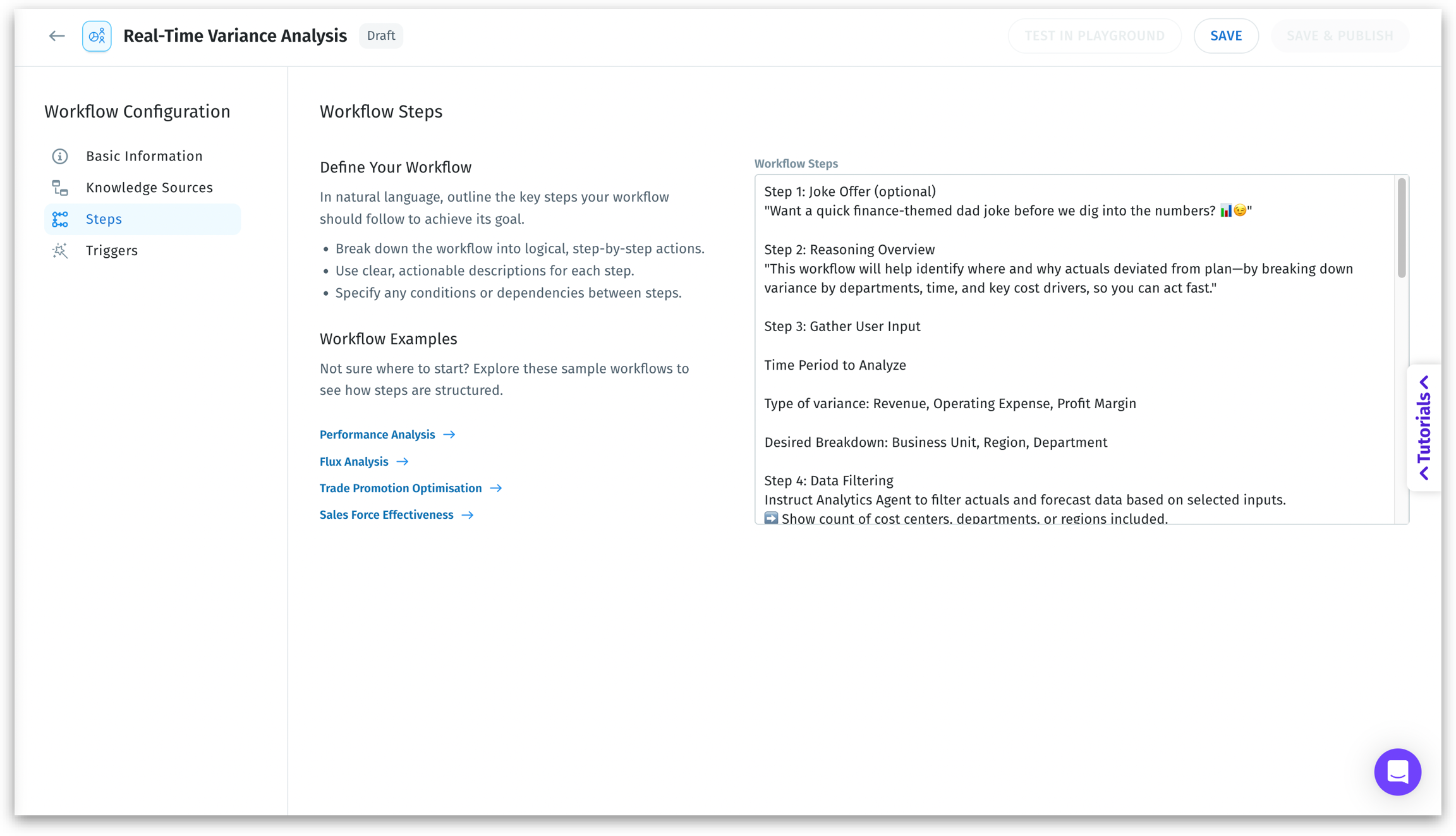 Define the logic of your workflow in natural language steps. Each step maps to one or more AI Agents (e.g., Planner, Data Prep, Insights). Links to ready-made example flows are available. Click on any sample analysis to view the workflow steps.