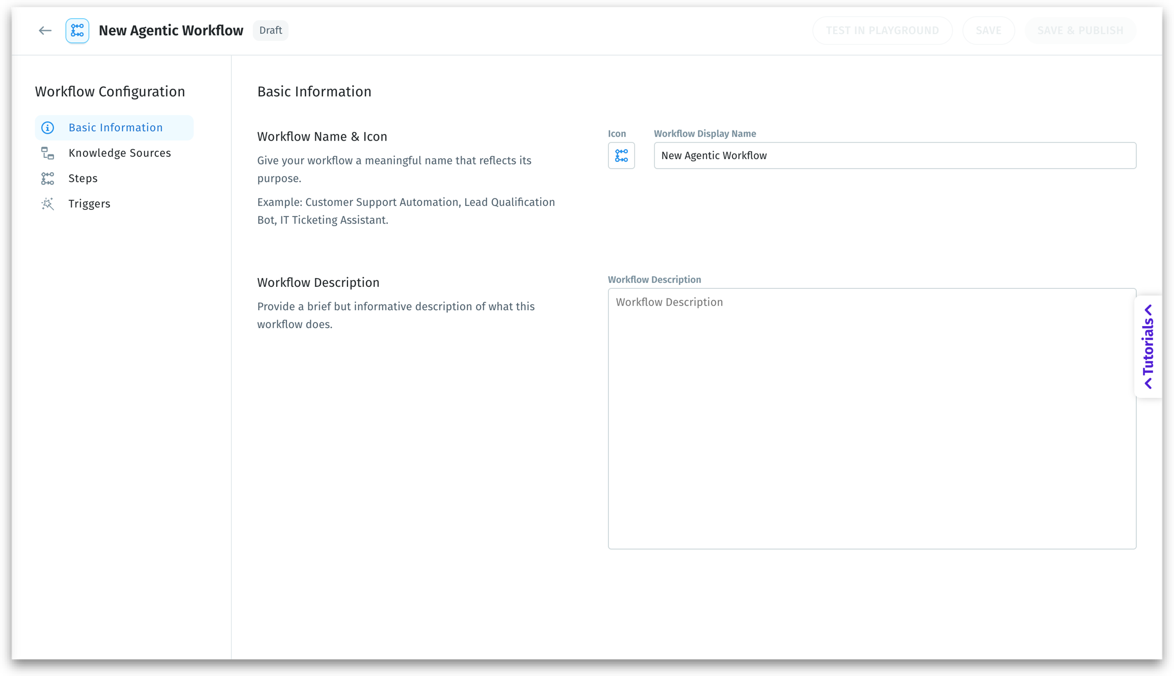 Set up the foundational identity of your Agentic Workflow—its name, icon, and a short description of what it does.