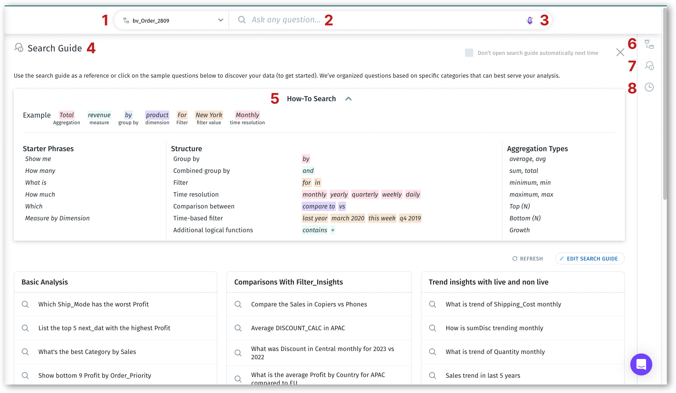 Explore the Tellius Search interface—learn how to use the search bar, voice queries, Business Views, and guides to run natural language data searches.