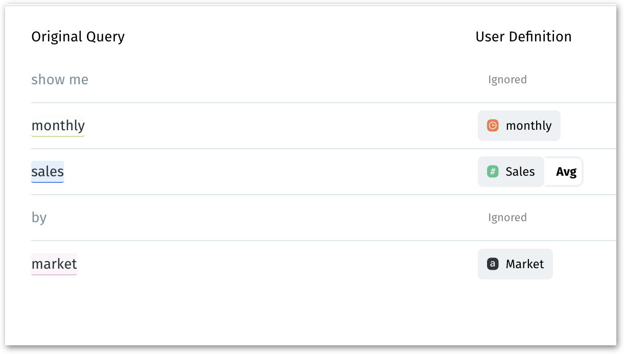 For instance, you could click between "regional" and "sales manager" to remove the space, creating a new term "regionalSalesManager". Instead of referring to "Region" and "Sales Manager" columns separately, Tellius will attempt to interpret this as a single term. This manipulation helps Tellius learn the nuances of your query language, allowing for more accurate data retrieval in the future.