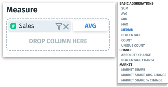Measure columns display an aggregation label. Click on the label to explore the full range of available aggregation options to modify how the data needs to be summarized.