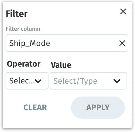 Clear: Resets the filter configuration, removing any selected values and operators from the current filter setup.