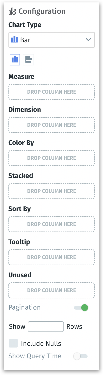 Please note that each type of chart will have a unique configuration. Not all charts will have all the above-mentioned fields. For example, KPI charts will have only Measure, Tooltip, and Unused fields for simple yet effective visualization, whereas bar charts offer a wider range of fields to provide more detailed and complex visualizations.