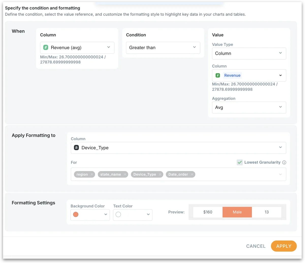 Example scenario: "Highlight any revenue value that's above the overall average across all regions, states, devices, and time periods"