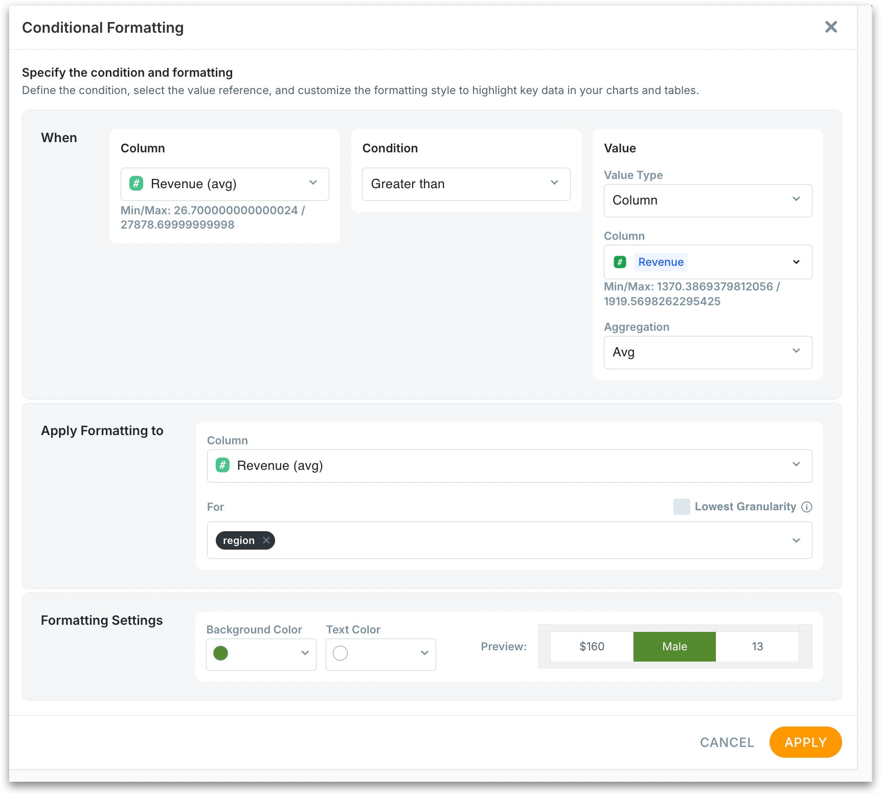 The BV COLUMNS option significantly expands your conditional formatting capabilities by allowing comparisons against any field in your dataset, not just those currently visible in your table. For example, you could format Revenue based on Customer_Segment even if Customer_Segment isn't displayed in your current table.