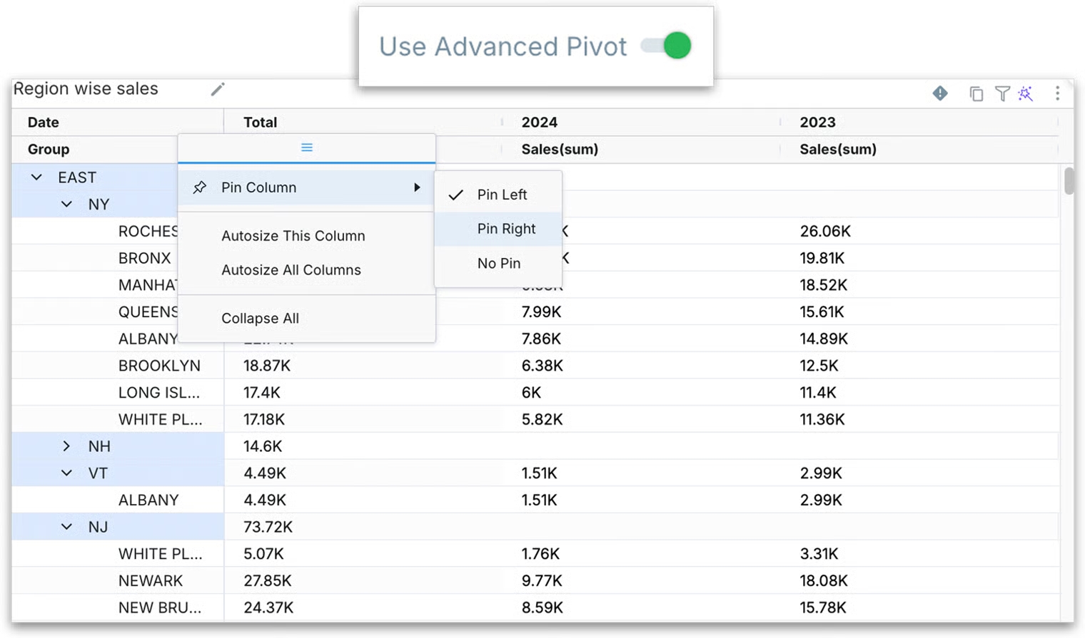 The advanced pivot automatically calculates rollup totals at each hierarchy level (so you can see regional performance alongside state-level detail). Row totals show aggregations for parent categories, while column totals provide summaries across time periods or metric dimensions.