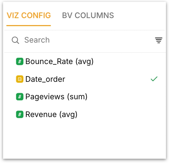 If using Column type, select from Viz Config fields or underlying Business View (BV) columns.
