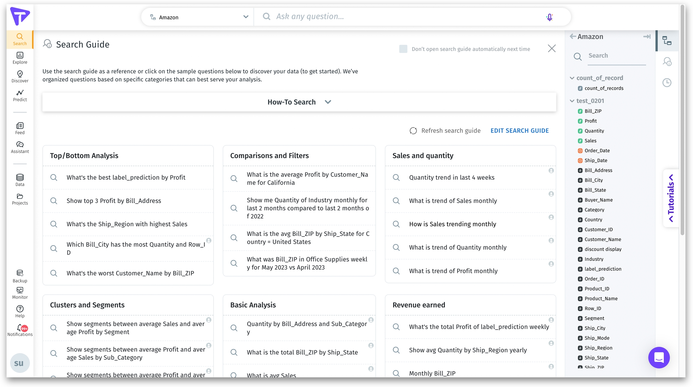 Upon selecting the Search tab in Tellius, users are greeted with a set of nine distinct cards, each representing a category of ready-to-implement search queries. The structured categorization of queries not only enables users to select the most relevant search queries but also helps users quickly overcome the initial uncertainty of query generation.