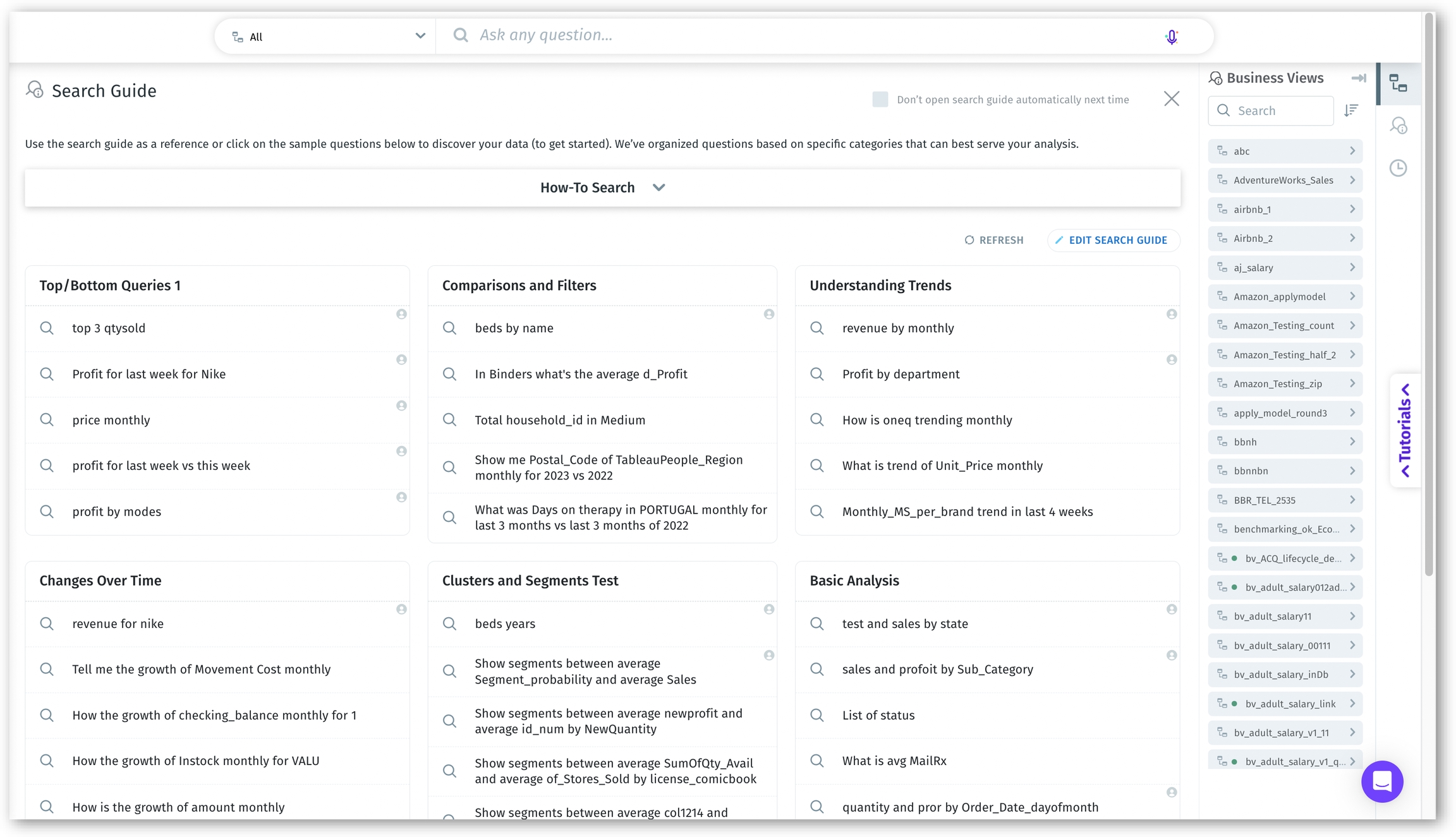 To help users make the most of the search functionality, admins can customize the Search Guide. The search queries can be edited and removed to make sure they align with the requirements specific to each Business View.