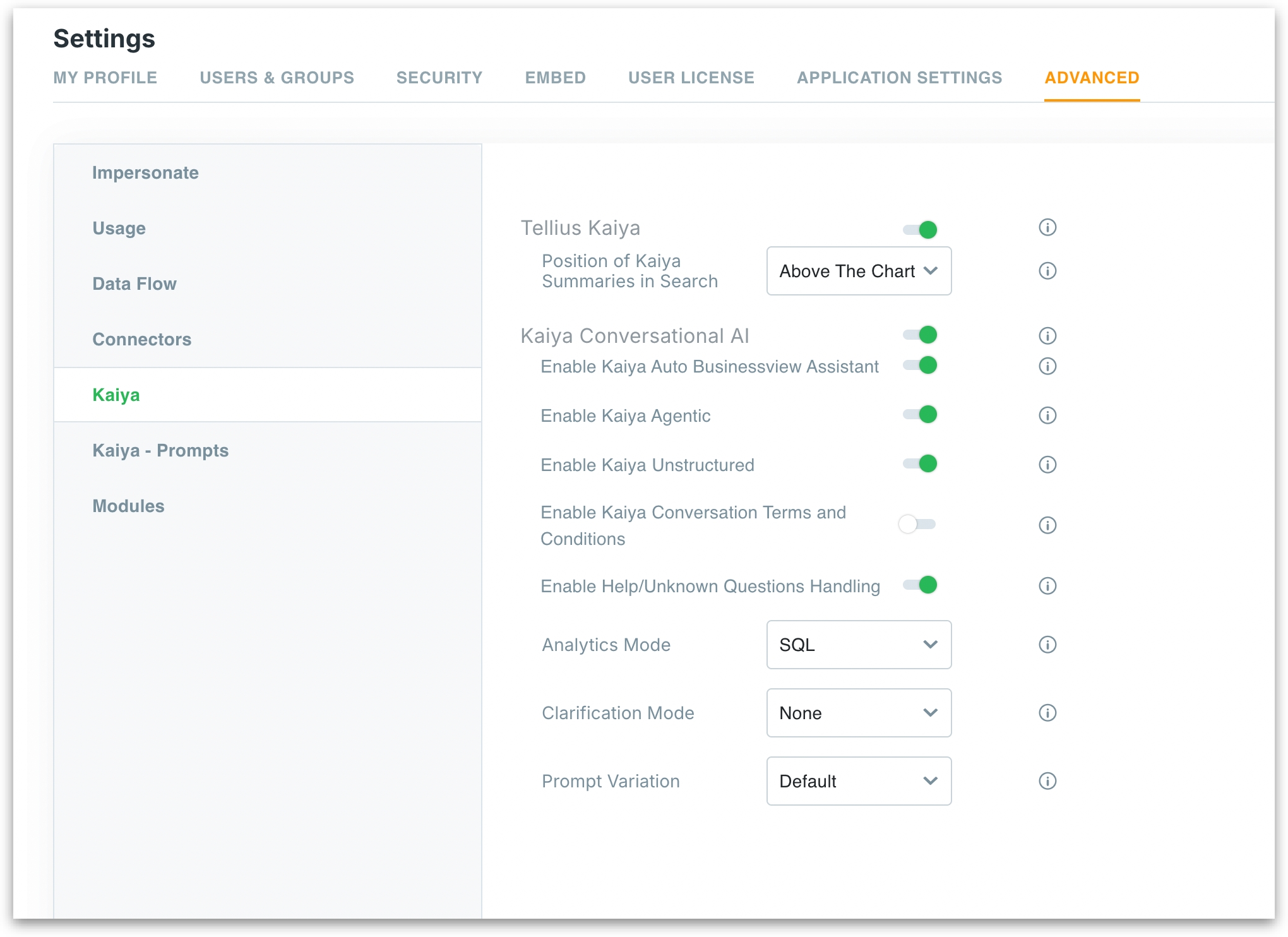 This section walks admins through the Kaiya settings. The place where you turn on conversational AI, agentic analysis, and control how Kaiya responds to users. From here you can enable Kaiya, allow it to assist on selecting the right Business Views, switch on Agentic mode and more. Use this page to decide what Kaiya can do and how smart/interactive you want it to be for your users.