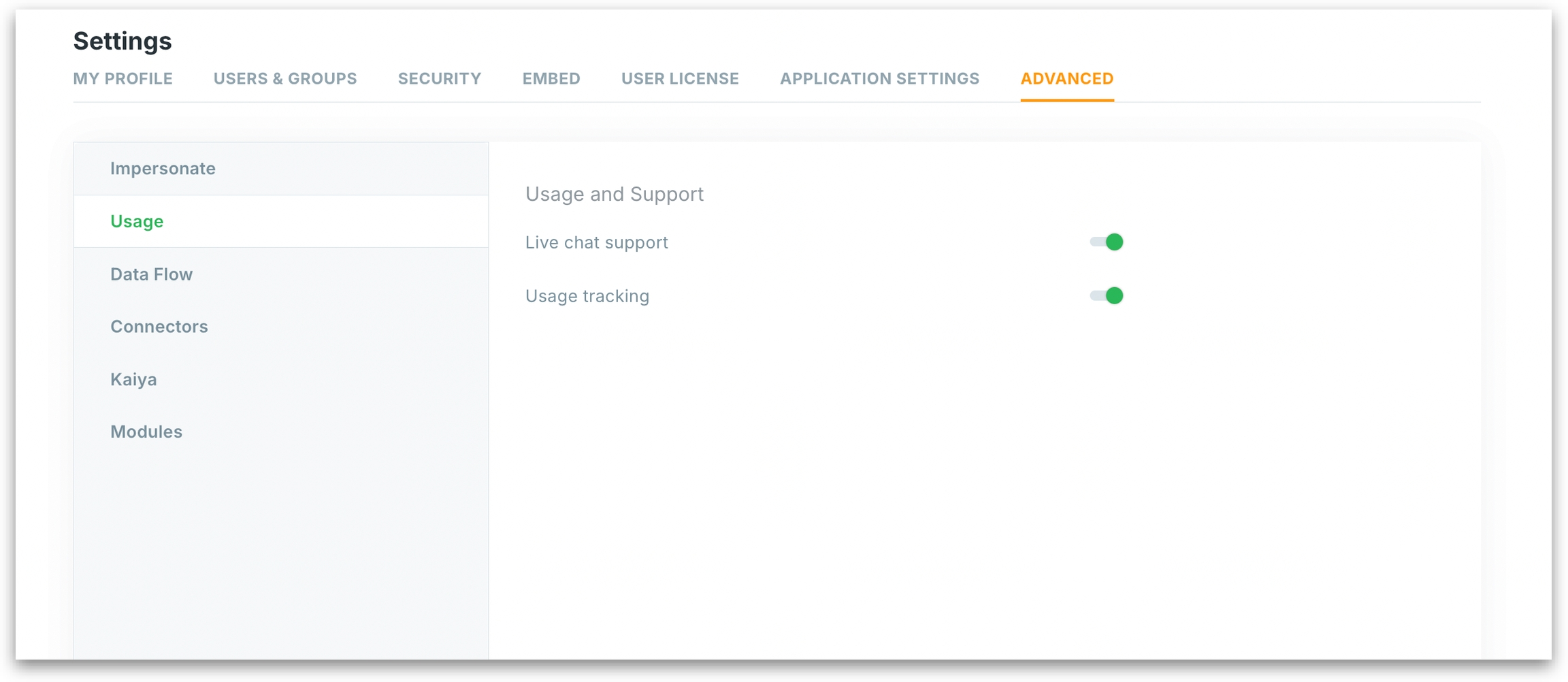 Under Settings → Advanced Settings → Usage, admins can control two key support and monitoring features.