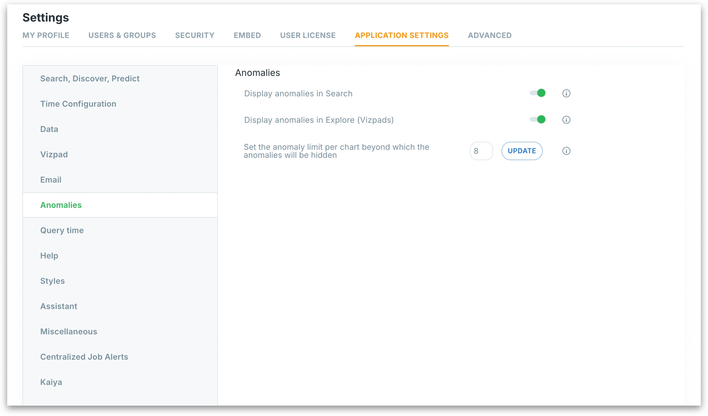 Configure anomaly detection in Tellius to highlight outliers, spikes, and dips in Search and Vizpad charts. Set display limits and control anomaly visibility.