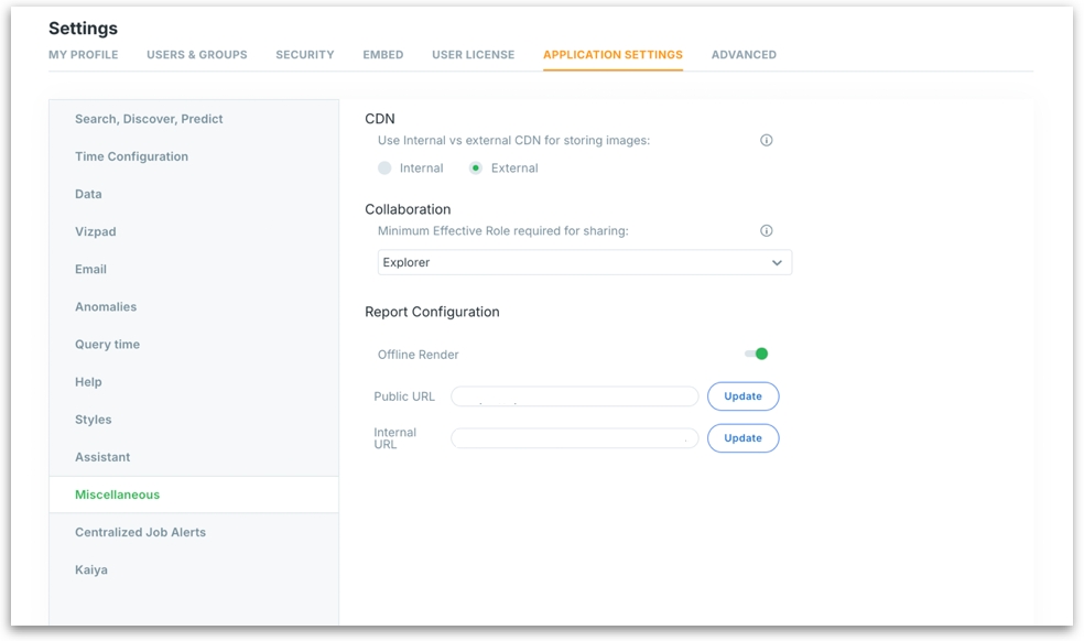 Public URL: The URL used by external users or services to access shared or rendered content from Tellius. Click on Update to apply changes.