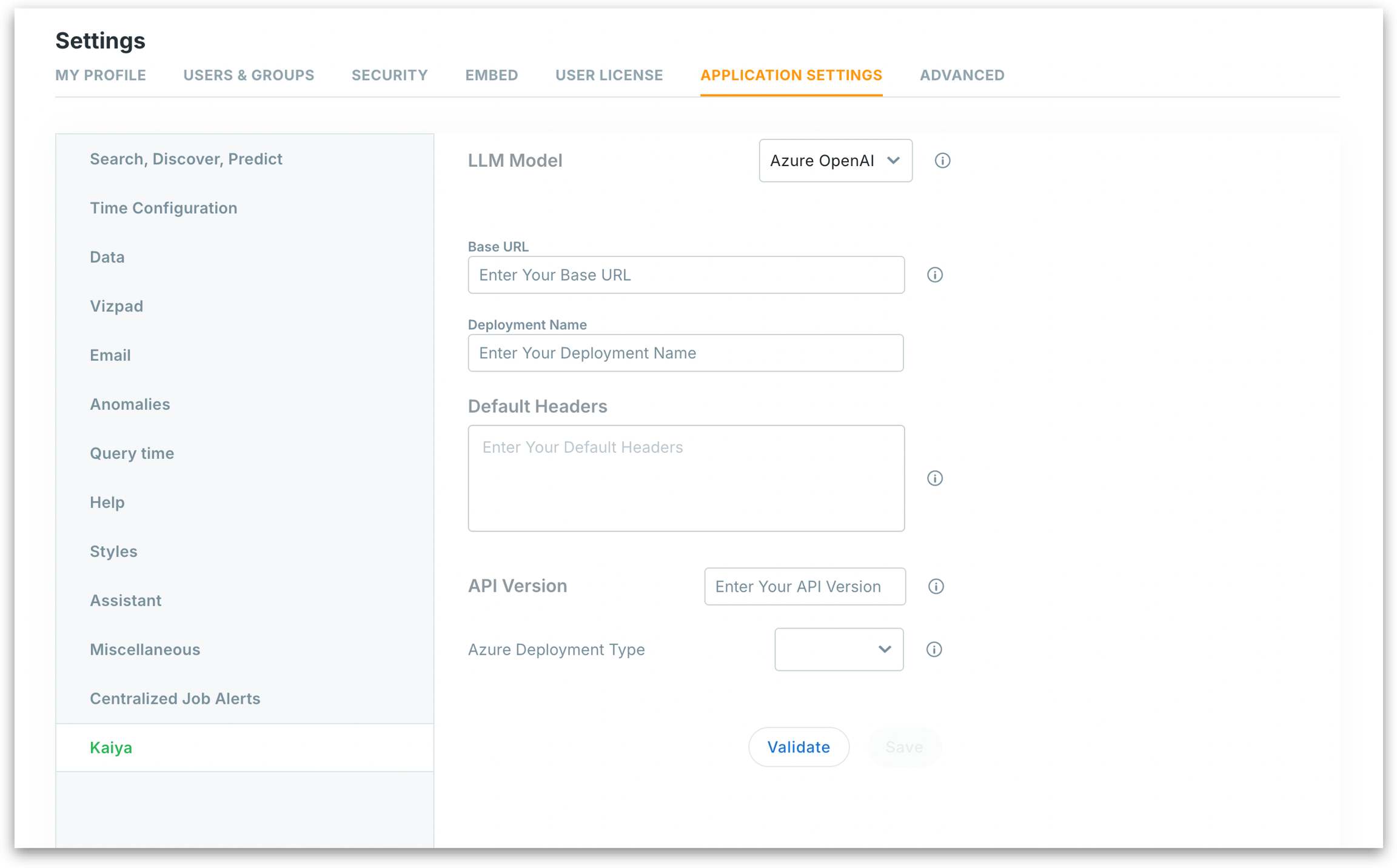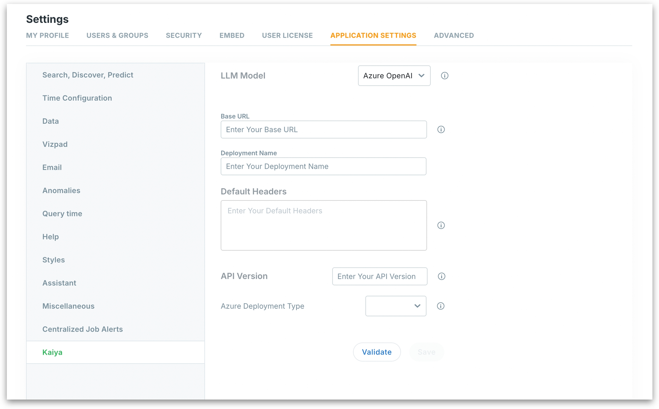 Configure LLMs for Kaiya to power natural language insights. Connect OpenAI, Gemini, Azure OpenAI, or Bedrock models with secure validation and setup.
