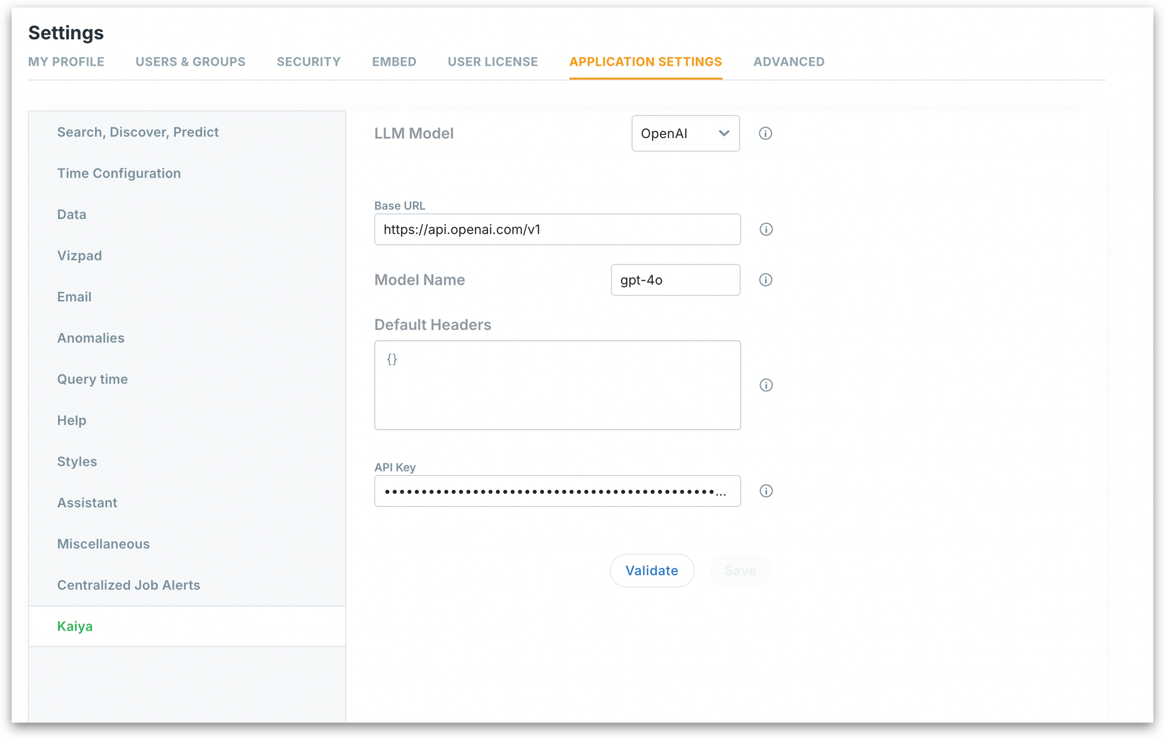 From Tellius 5.4, admins can configure which LLM (Large Language Model) Kaiya uses to interpret questions, generate insights, and trigger workflows. This is managed under Settings → Application Settings → Kaiya.
