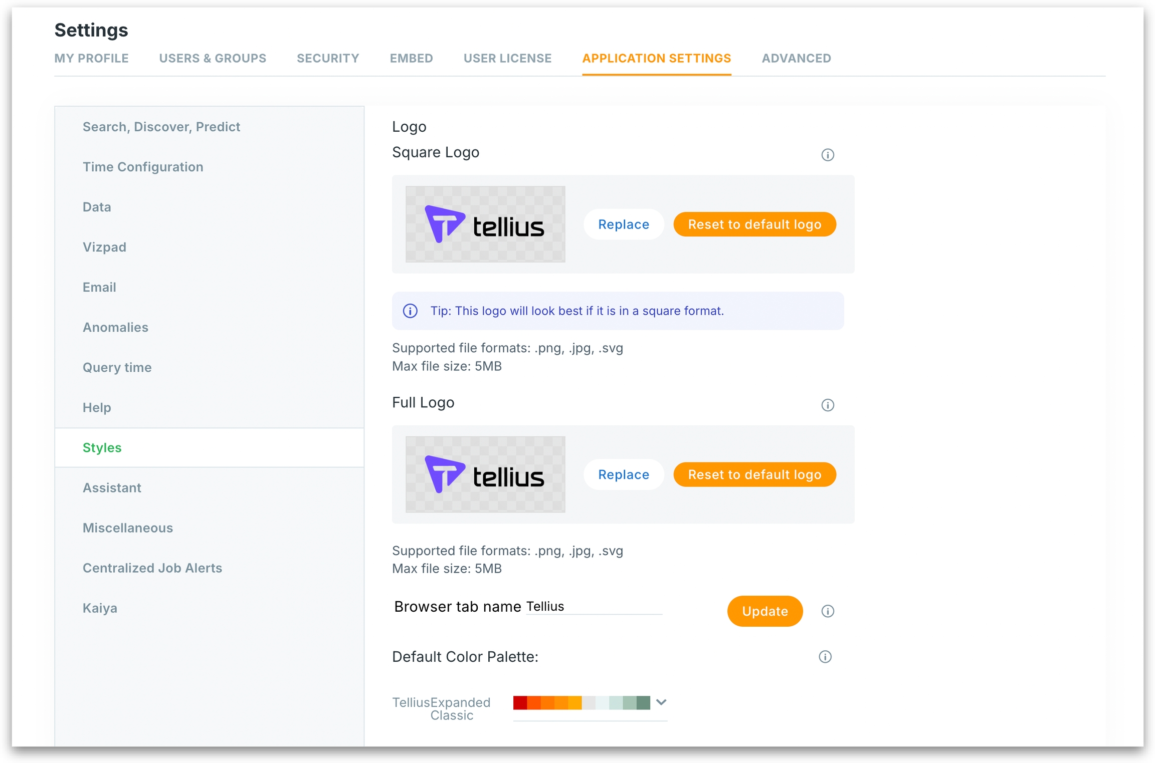 Under Settings → Application Settings → Styles, admins can personalize Tellius environment to reflect their organization's brand identity.