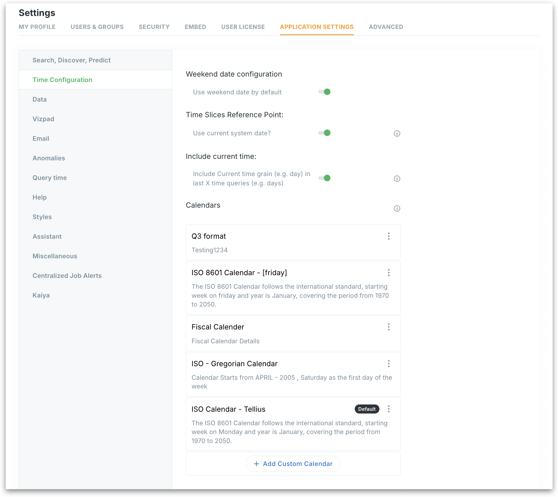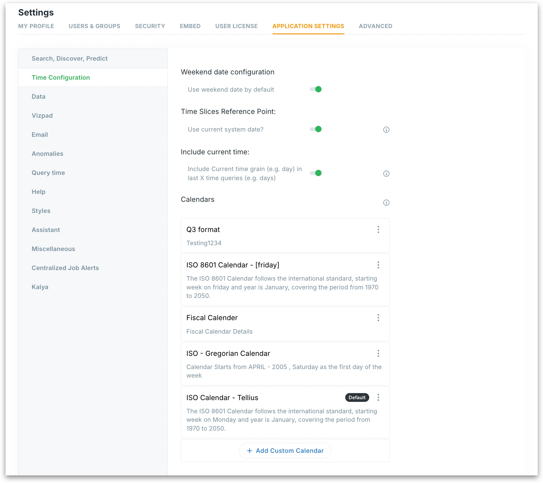 Configure how Tellius handles time-based data with flexible options for weekend dates, dynamic time slices, current period inclusion, and custom calendars