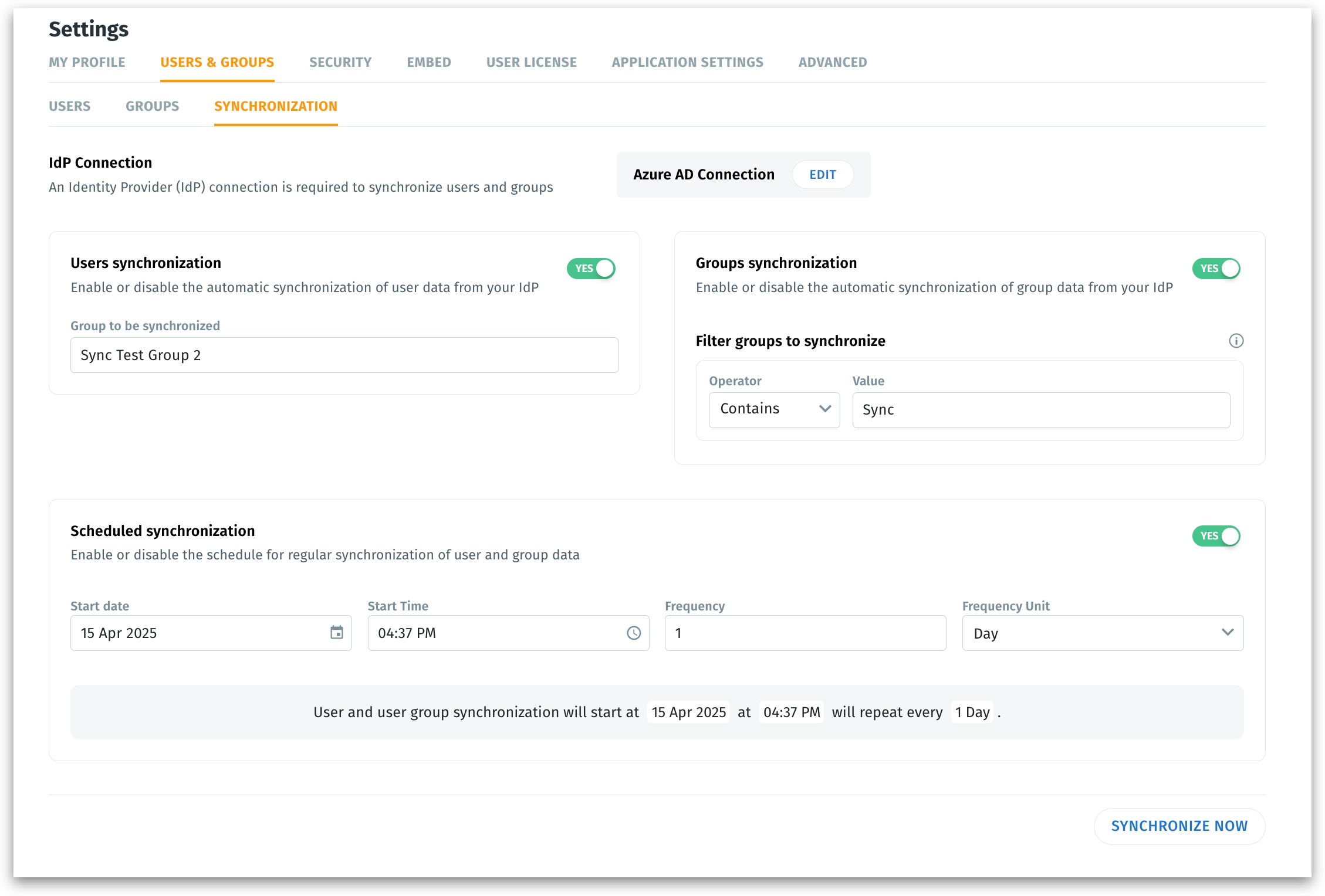 Under Settings → Users & Groups → Synchronization, the User-Group Synchronization allows seamless integration with IdP, enabling automated user and group provisioning. This reduces manual effort, ensures data consistency, and centralizes access management—especially for organizations using SAML-based authentication.