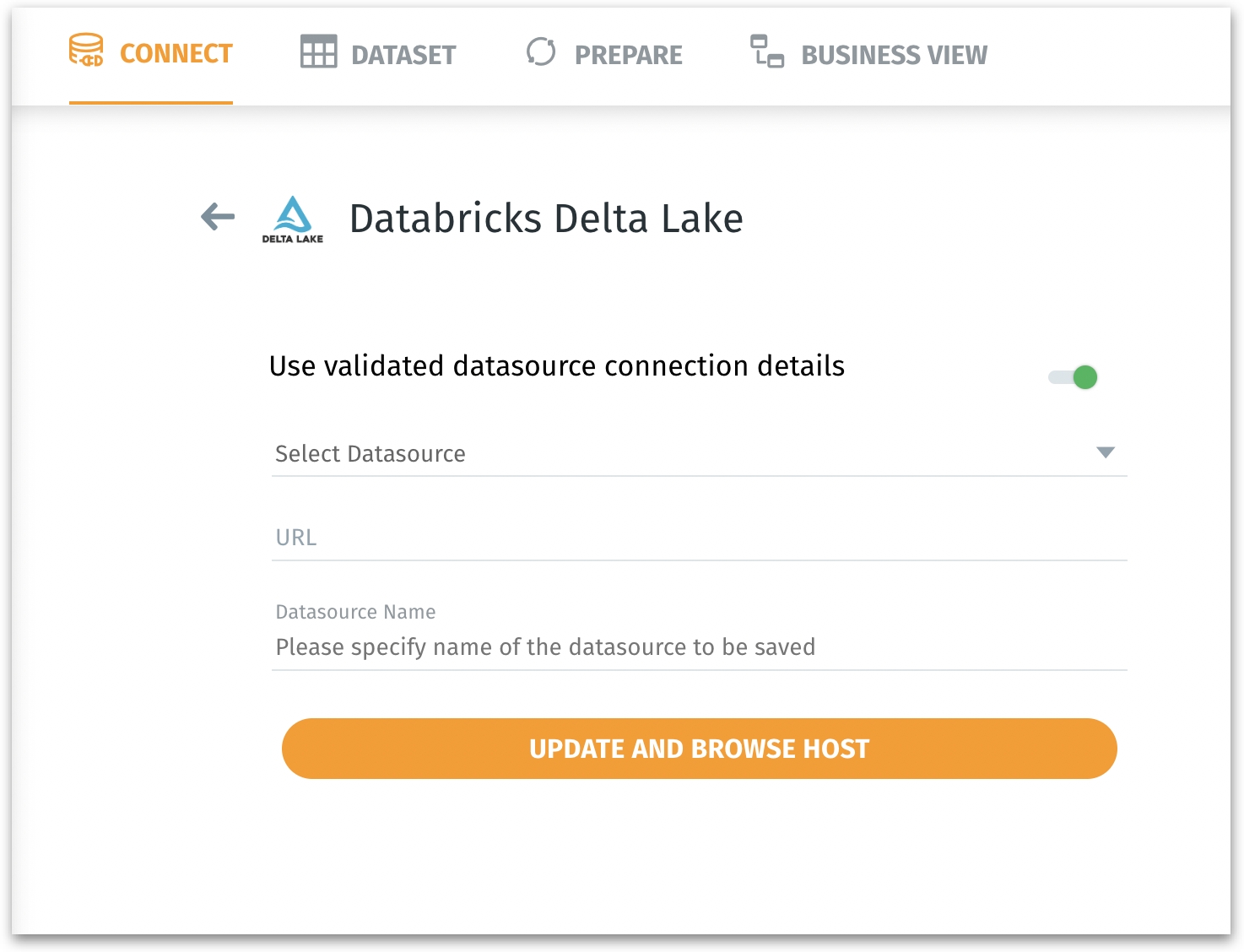 Log in to the Tellius platform and navigate to Data -> Connect -> Create New -> Databricks Delta Lake.