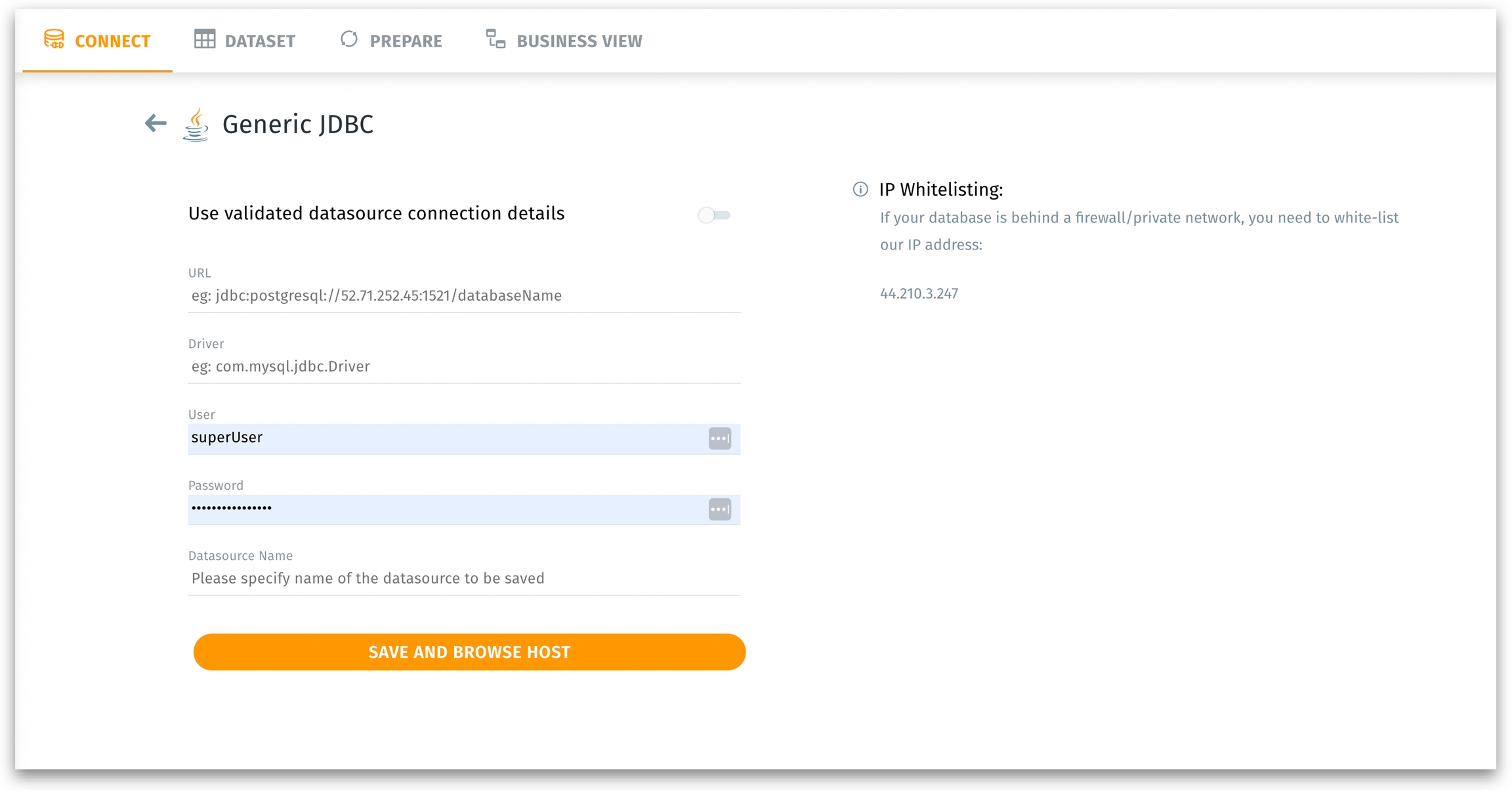 Use validated datasource connection details: When enabled, it reveals a dropdown to choose from existing, previously configured JDBC connections.