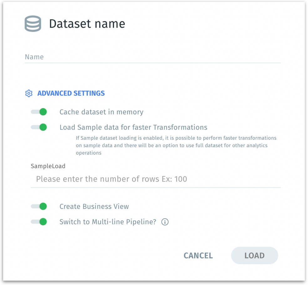 Create Business View: Enables you to directly create a Business View after loading the dataset. A Business View provides a semantic layer making the data more accessible and understandable for business users. Streamlines your workflow by letting you move directly from data ingestion to semantic modeling.