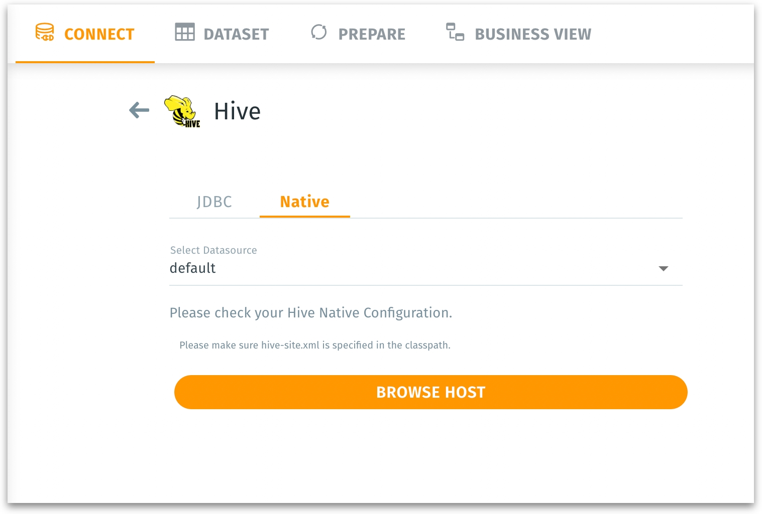 Select datasource: Lists all pre-validated Hive connections. Select the one you want to reuse and all the fields will be filled automatically as configured.