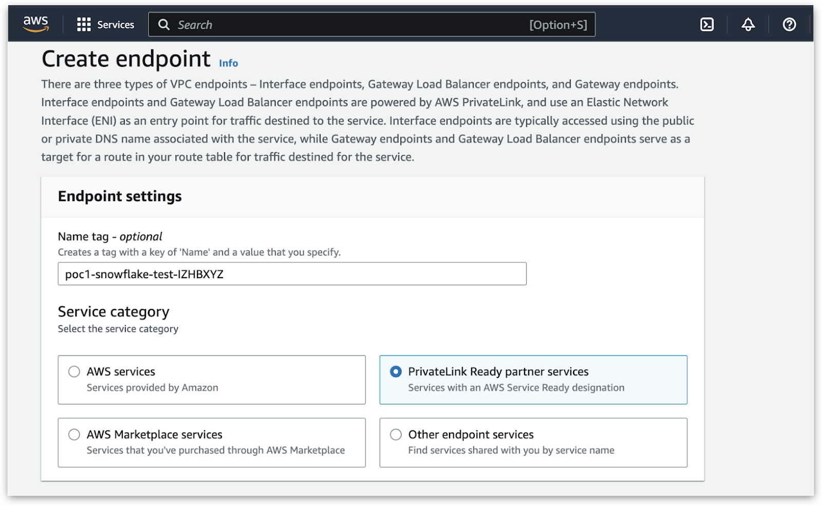 Create a VPC Endpoint on the AWS console for tunneling PrivateLink endpoints. Enter the resource ID of