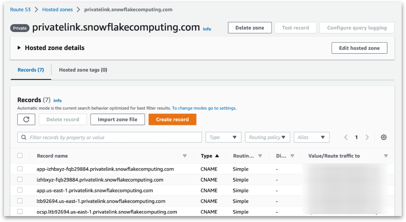 When creating the private DNS-hosted zone, make sure to choose the same VPC as the Kubernetes cluster/instance and add CNAME records for all the URLs printed in the JSON output from Step 2.