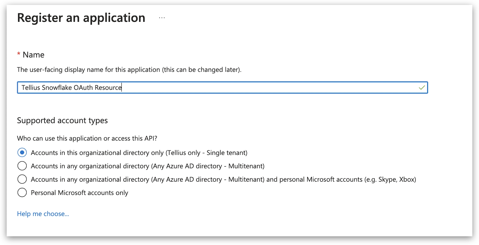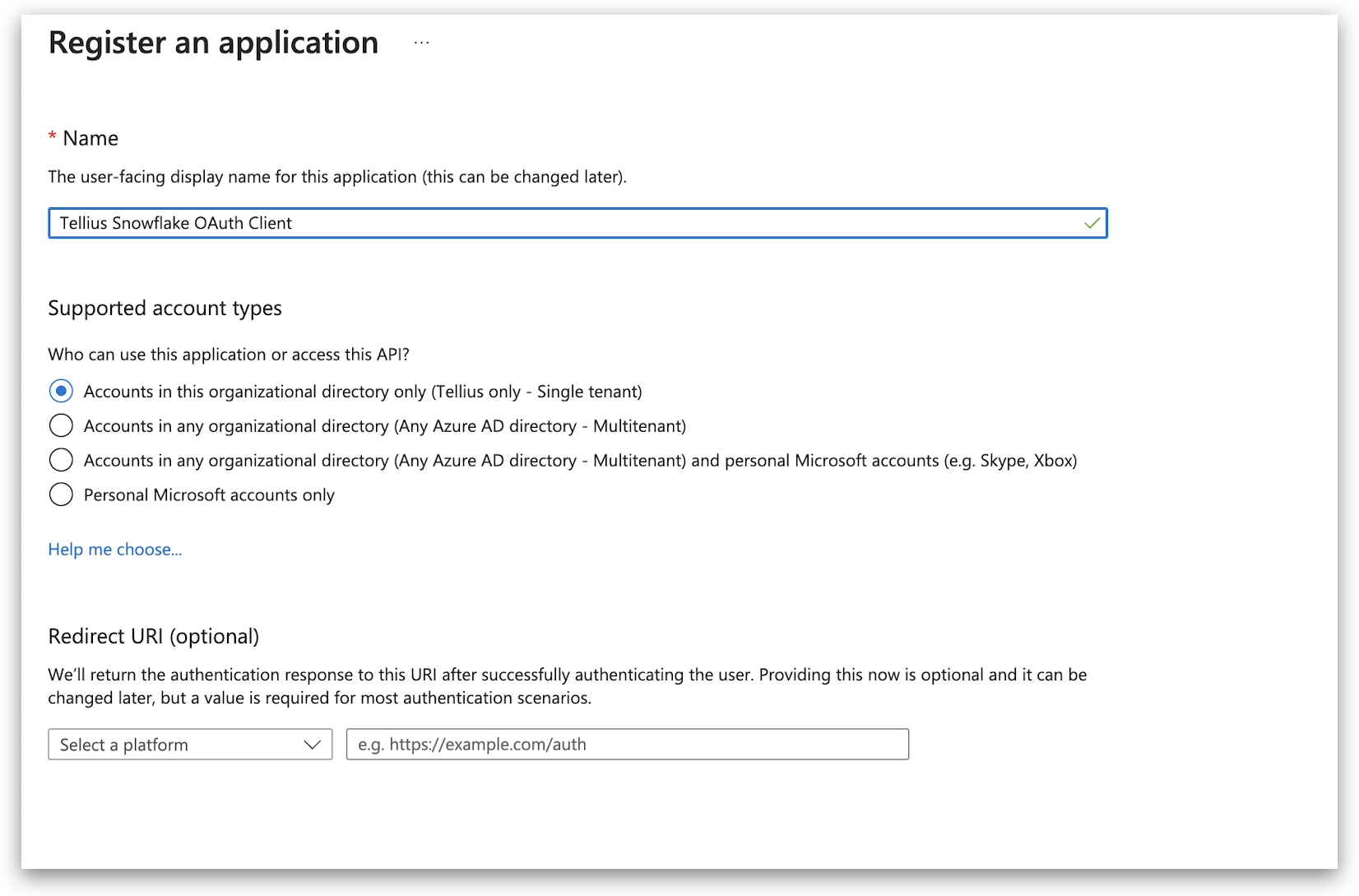 Provide a suitable name (for example: Tellius Snowflake OAuth Client) and under Supported account types, choose Accounts in this organizational directory only (Tellius only - Single Tenant).