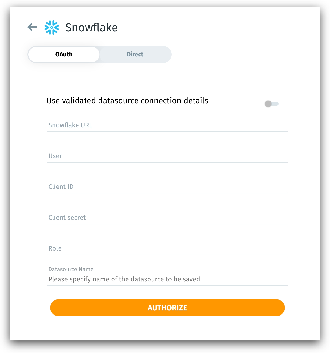 Once you choose Snowflake as your datasource, you will get the option to choose OAuth-based authentication or a direct way of authentication (using username and password). For direct access method, please refer to this page.