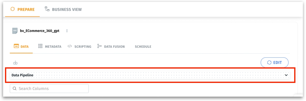 Data pipeline can be found under Data → Prepare → Data and Data → Prepare → Metadata, just above the search bar.