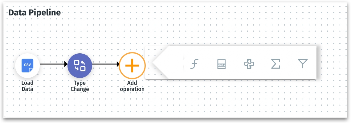 From the Data Pipeline, you can also click on Add Operation (+) button to perform new actions. For more details about the actions displayed, check out this section.