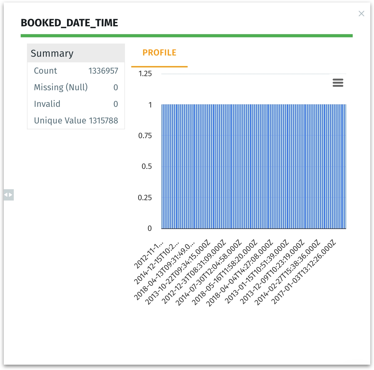 In the above example, each vertical blue bar represents a set of date/time values plotted on an X-axis. The X-axis labels can appear bunched if the dataset is large or if date values are extremely granular. Hovering over may clarify the distribution.
