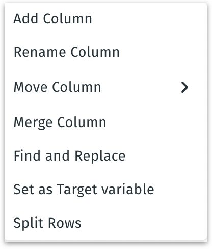 Move Column: Reorder columns in the dataset (e.g., bring an important column to the front). This has sub-options like Before previous column, After next column, Before column, and After column.