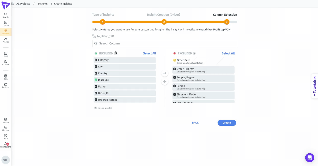 Select the columns that need to be considered for the creation of Insights under the **Discover** tab. The columns can also be included/excluded while creating Insights.