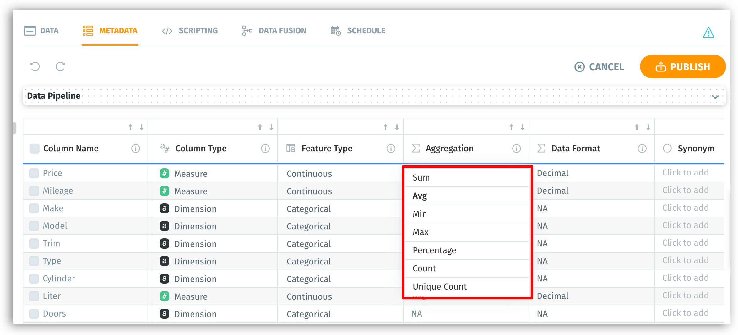 * The feature type, data format, and default aggregation of measures can be modified.