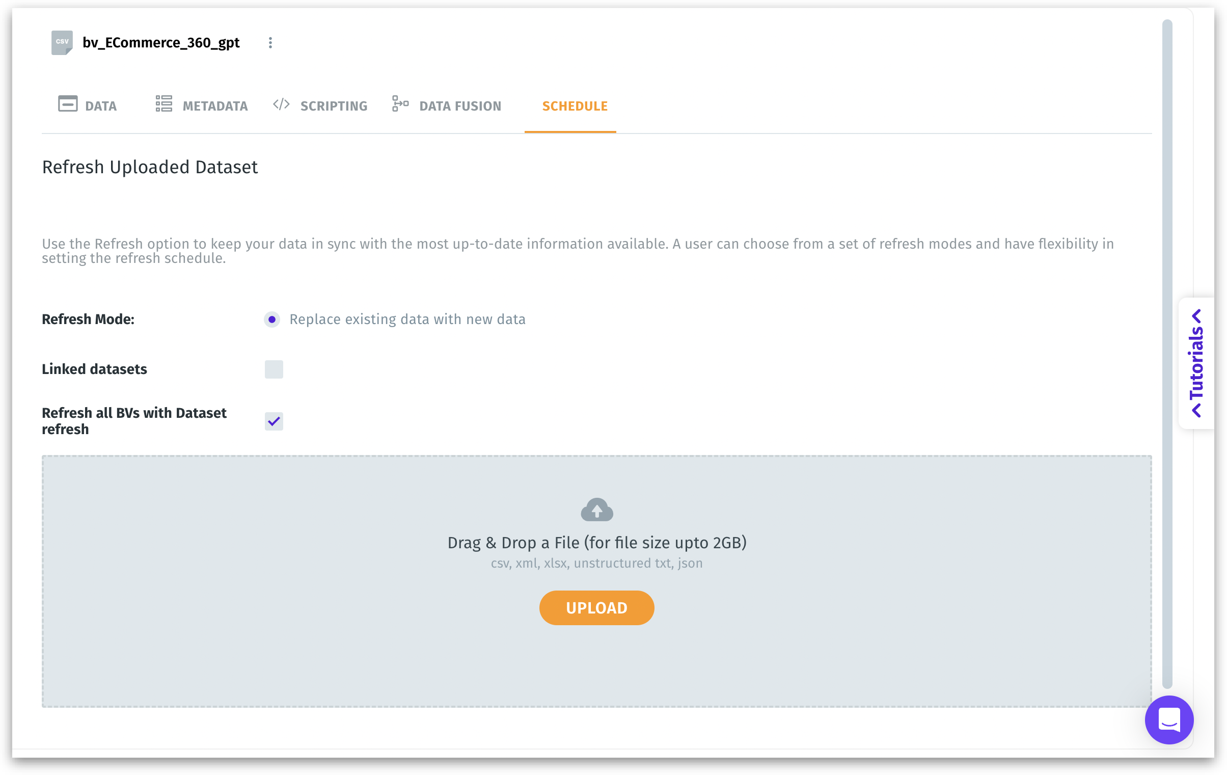 * **Drag & Drop a File**: For file-based datasets (CSV, XLSX, etc.) you can upload a new version in the same schema to refresh content (limit up to 2GB). Click on **Upload** to manually trigger an upload process for the replacement data.