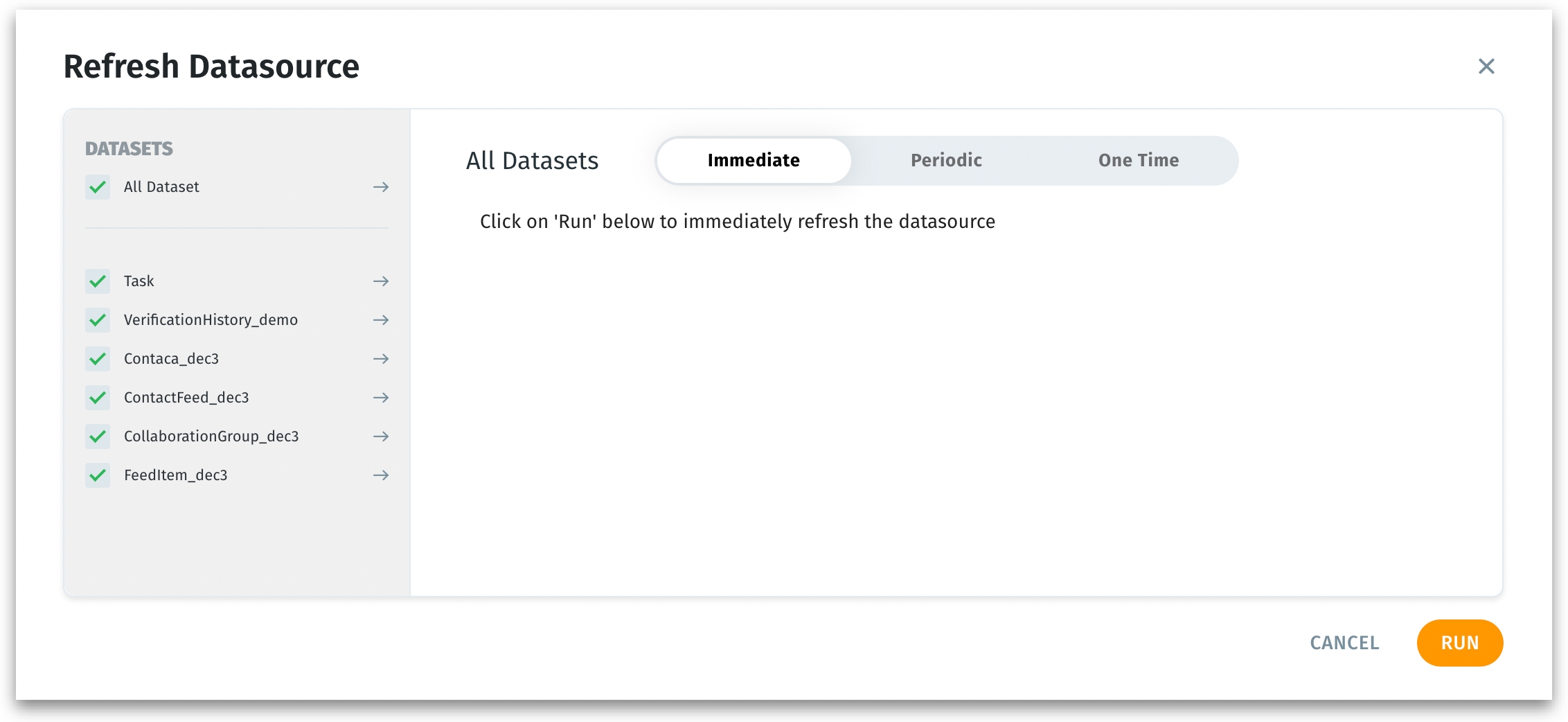Go to Data → Connect, click on the three-dot kebab menu of the required datasource and select Refresh. The following window will be displayed: