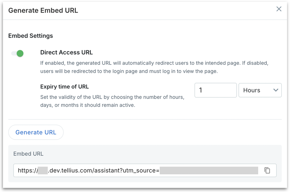 utm_sourceor similar context ID) expires, and the link becomes invalid.Once you click on Generate URL, the Embed URL will be generated.