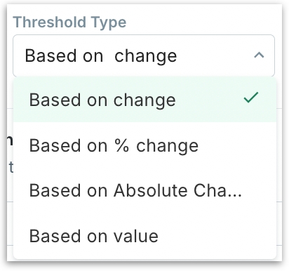 Based on change: Tracks if the difference between the current value and the previous period’s value crosses your set threshold. Example: Alert me if Sales increase or decrease by 100 units compared to last month.