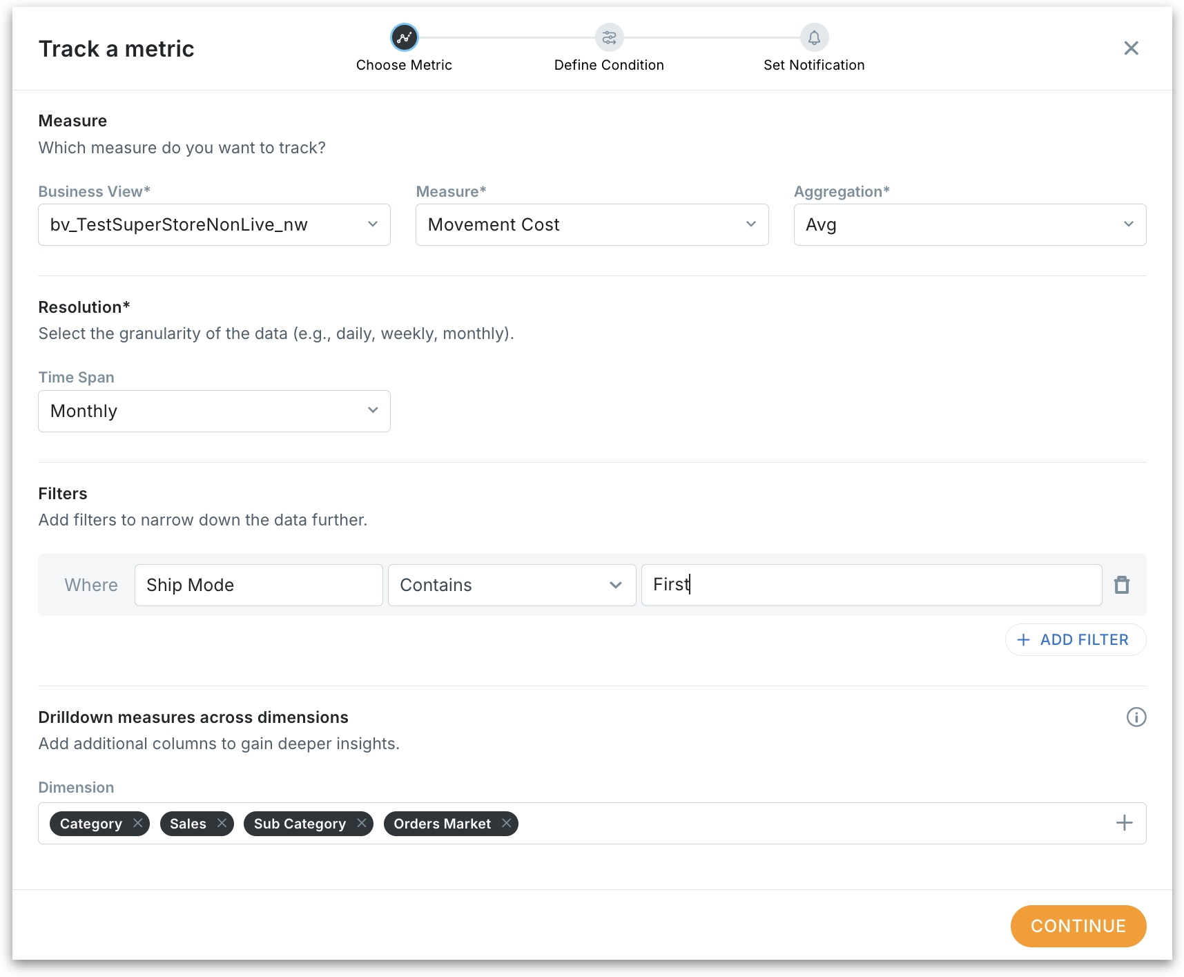 Add additional dimensions to break down and track the metric. Tellius will monitor how the metric behaves across each distinct value within these dimensions to highlight key segments.